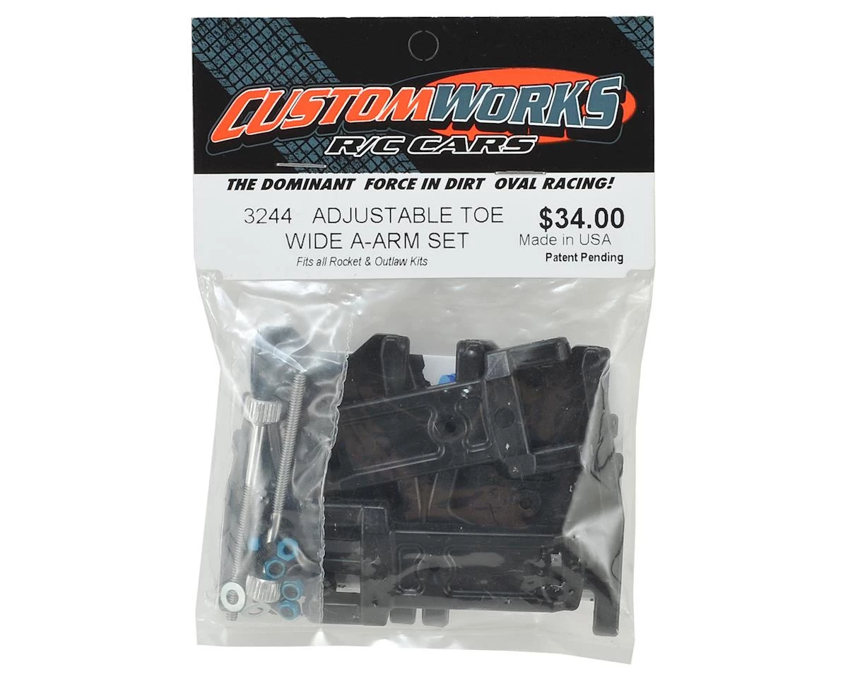 Custom Works Adjustable Toe A-Arm. These are an optional upgrade for the Outlaw 3 and Rocket Stage 3 kits. These allow you to easily change the rear toe settings on the car as track conditions change throughout the day. Package includes all the parts needed for the conversion.