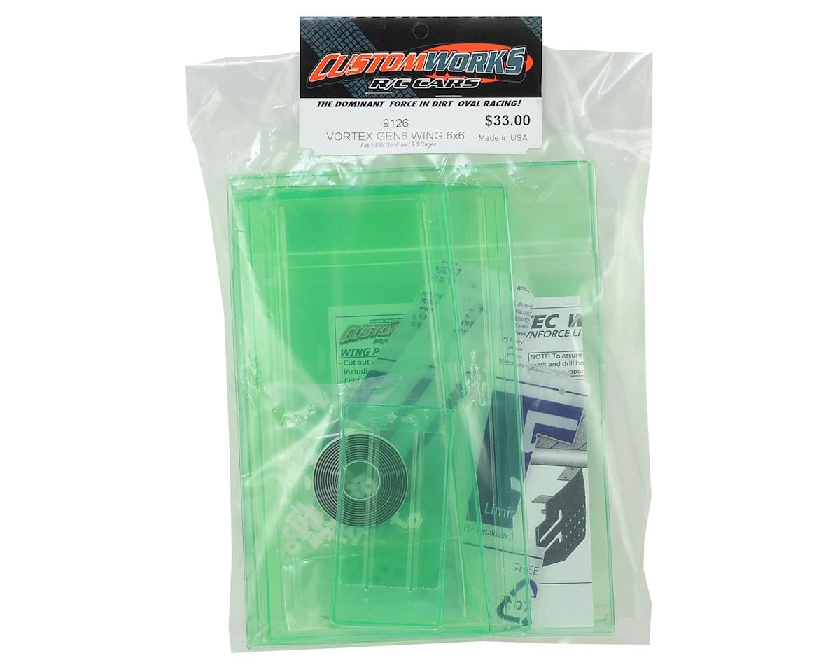 Custom Works 6×6″ Top Wing. This is a replacement for the Enforcer 7 kits. Package includes lexan wing panels with factory applied overspray film, and the nylon hardware required for building the wing.