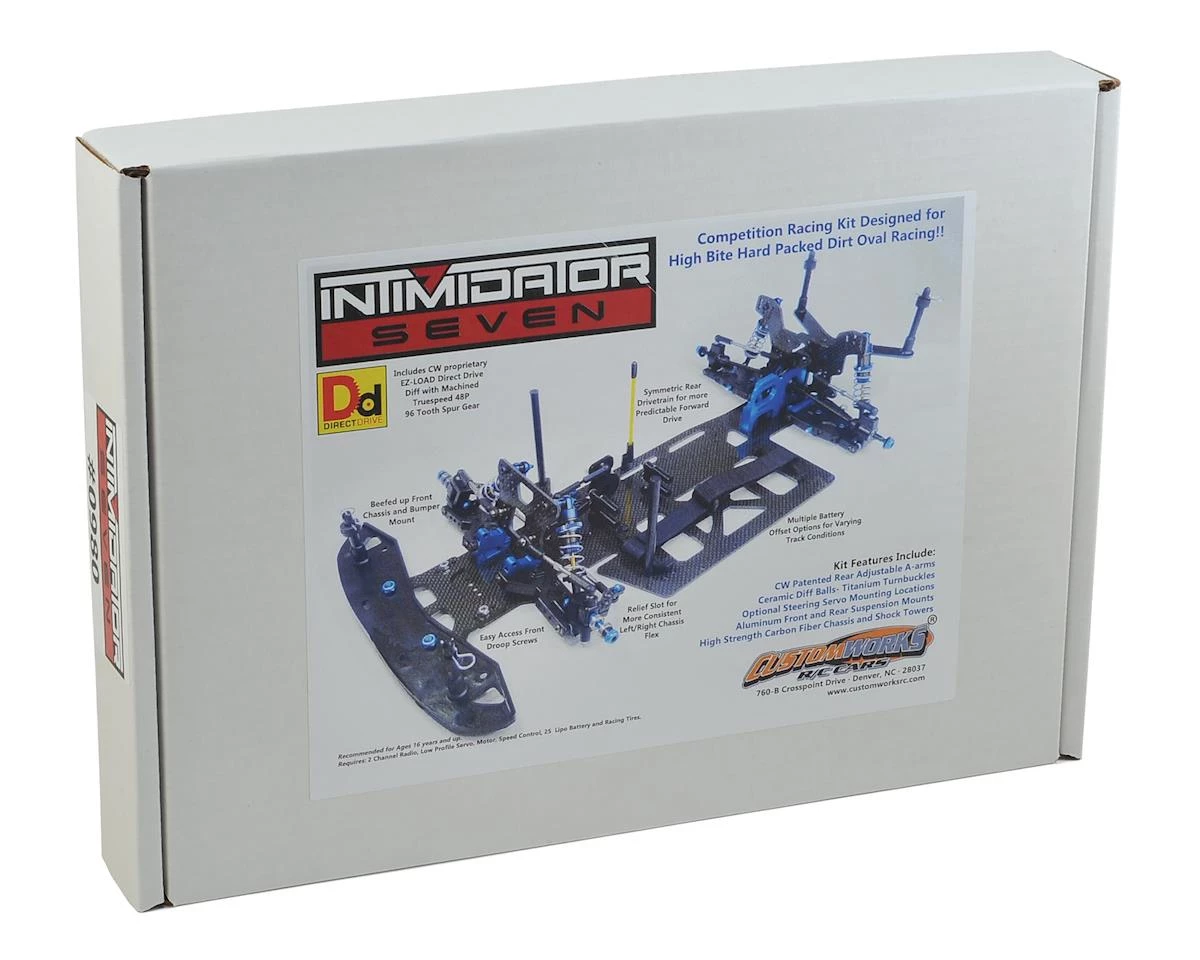 The Custom Works Intimidator 7 Direct Drive 1/10th Electric Latemodel Dirt Oval Kit was developed using the DNA of race winning cars, and over 30 years of Custom Works design experience and quality. The Intimidator 7 has been improved in many areas and is highly adaptable to tracks with a variety of different grip levels.