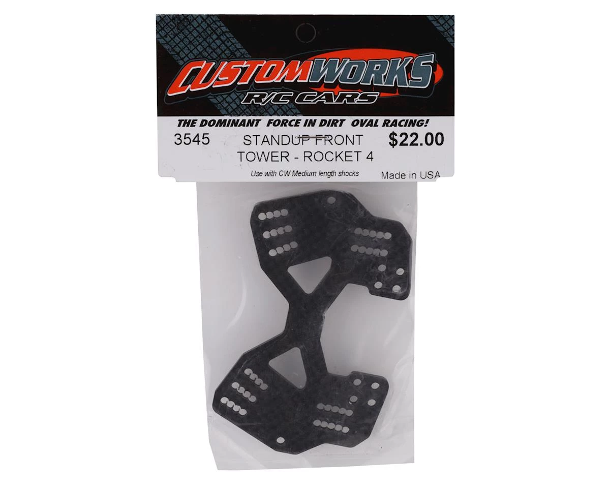 This optional Custom Works Rocket 4 Standup Shock Tower is intended for use with the Rocket Stage 4 1/10 Electric Latemodel Dirt Oval Kit. This shock tower is used with Custom Works medium length shocks.