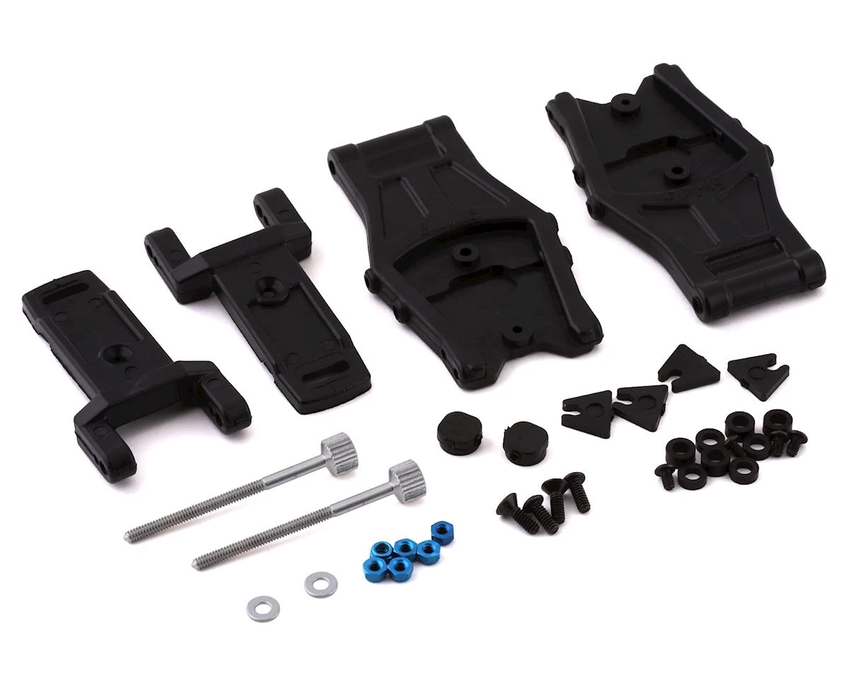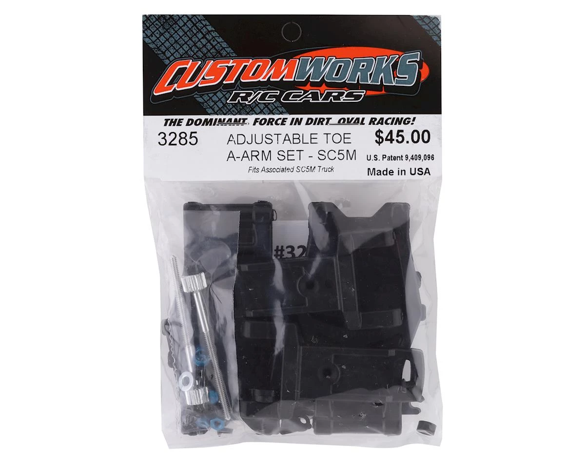 This optional Custom Works SC5M Adjustable Toe Rear Arm Kit is intended for use with the Team Associated RC10 SC5M 1/10 Electric 2WD Short Course Truck Kit. This adjustable rear arm will fit the stock SC5M and offers increased adjustment options for more precise tuning for SC Modified dirt oval conversions. Rear Toe is adjustable up to 9 degrees of toe in or out in each arm. Package includes all the parts needed to complete the suspension arm conversion.