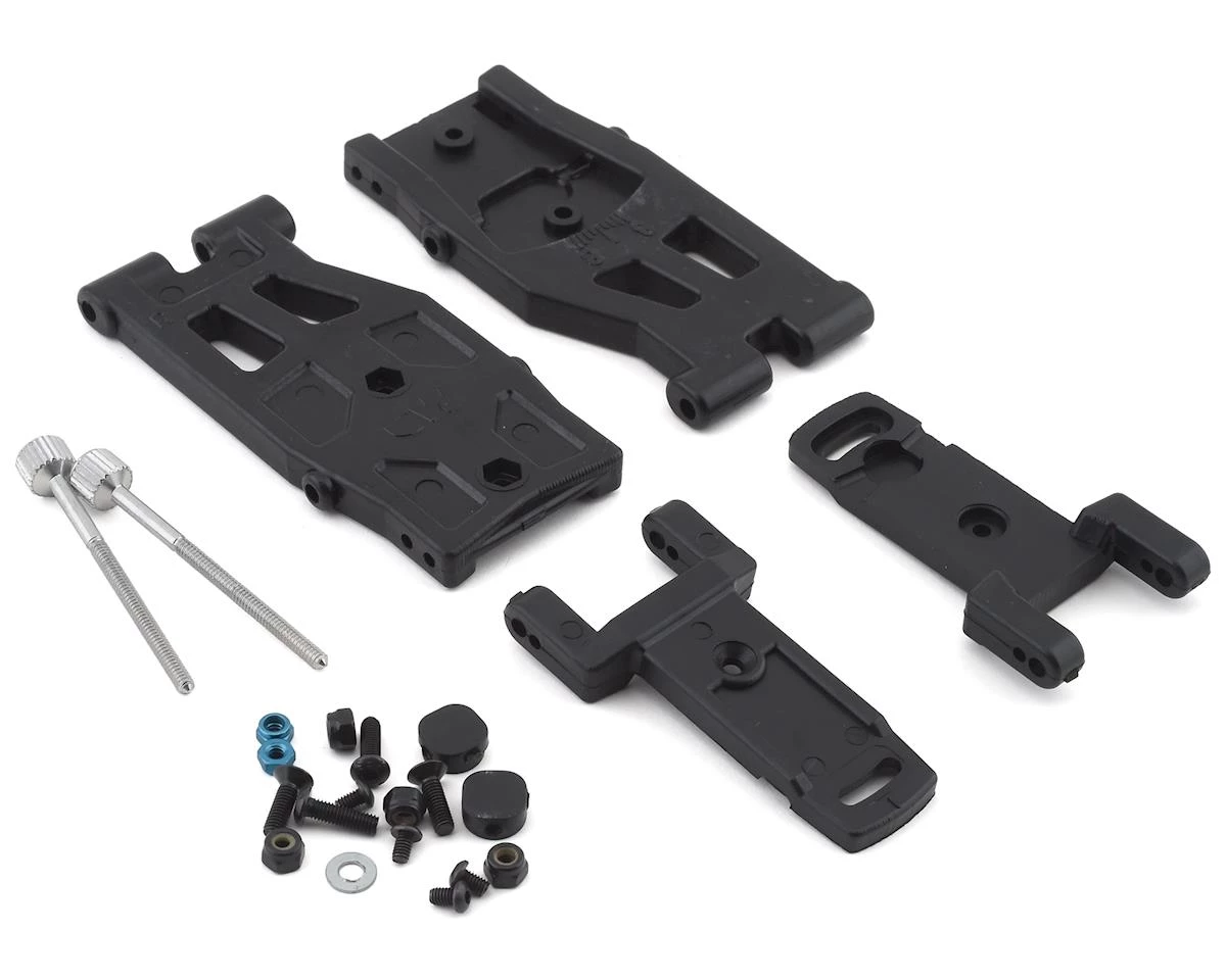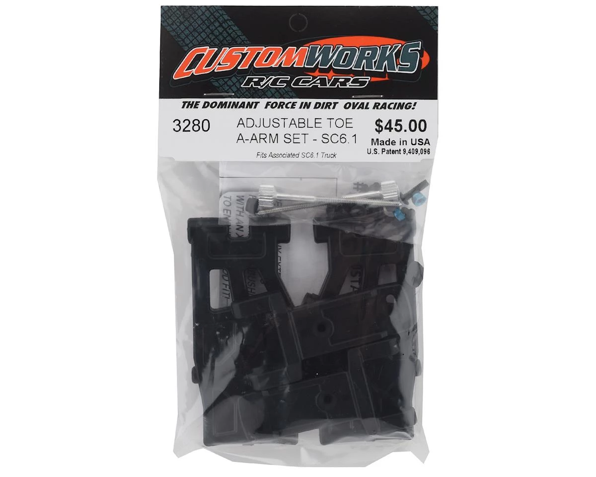 This is an optional Custom Works SC6.1 Adjustable Toe Rear A-Arm Set, compatible for use with Team Associated RC10 SC6.1 Off Road 1/10 Short Course Team Truck Kit. This adjustable rear arm set allows adjustment of up to 8 degrees toe in or out on each arm.
