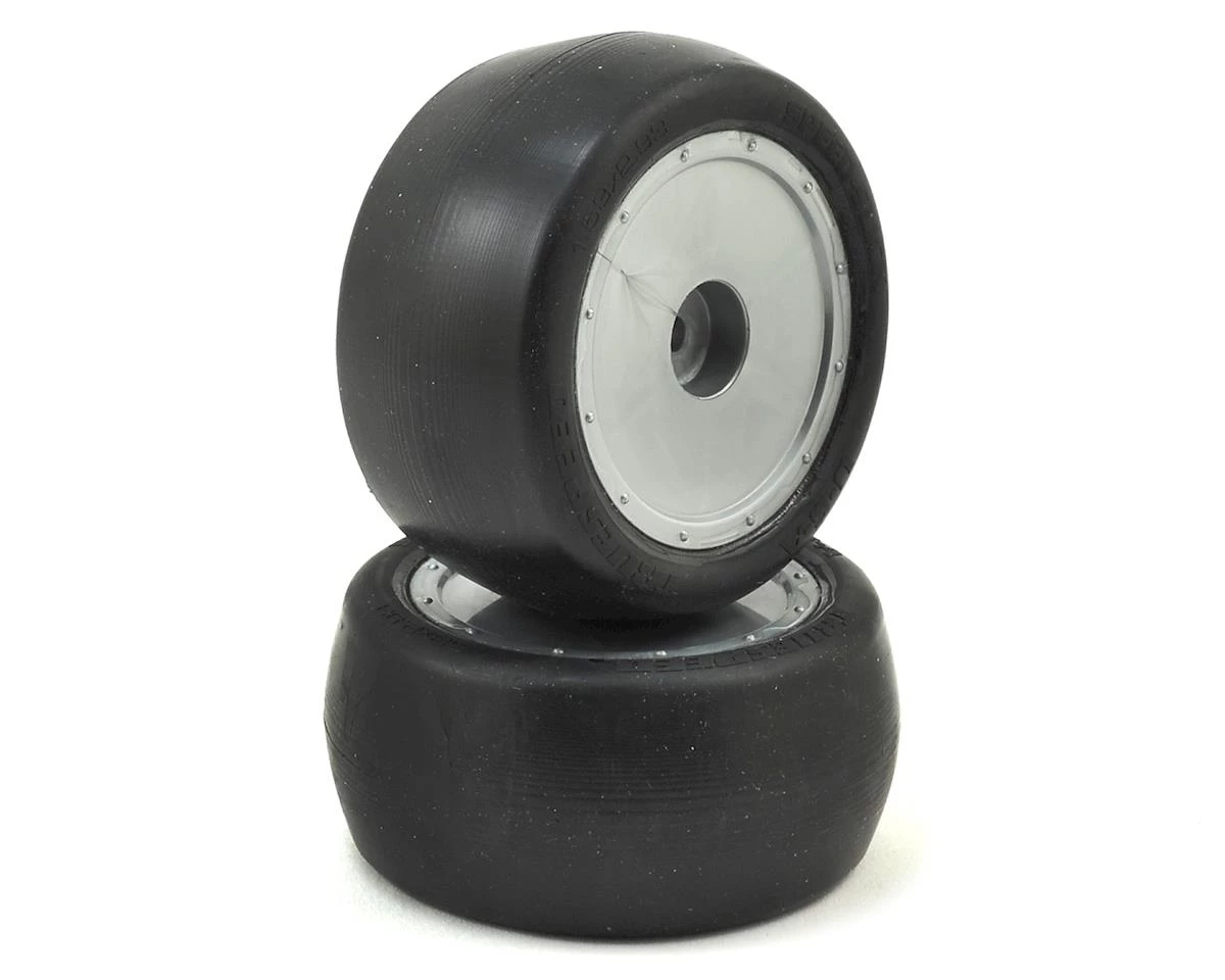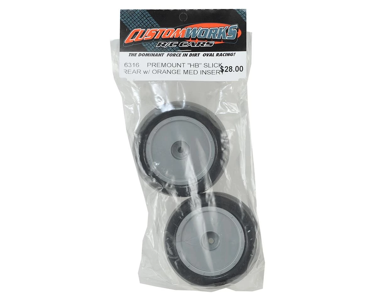 Custom Works Slick Pre-Mounted Rear Tires. These tires are available in standard and soft “HB” compounds and are pre-mounted on standard Custom Works 2.0″ rubber tire wheels with orange medium inserts. Package includes two rear tires.