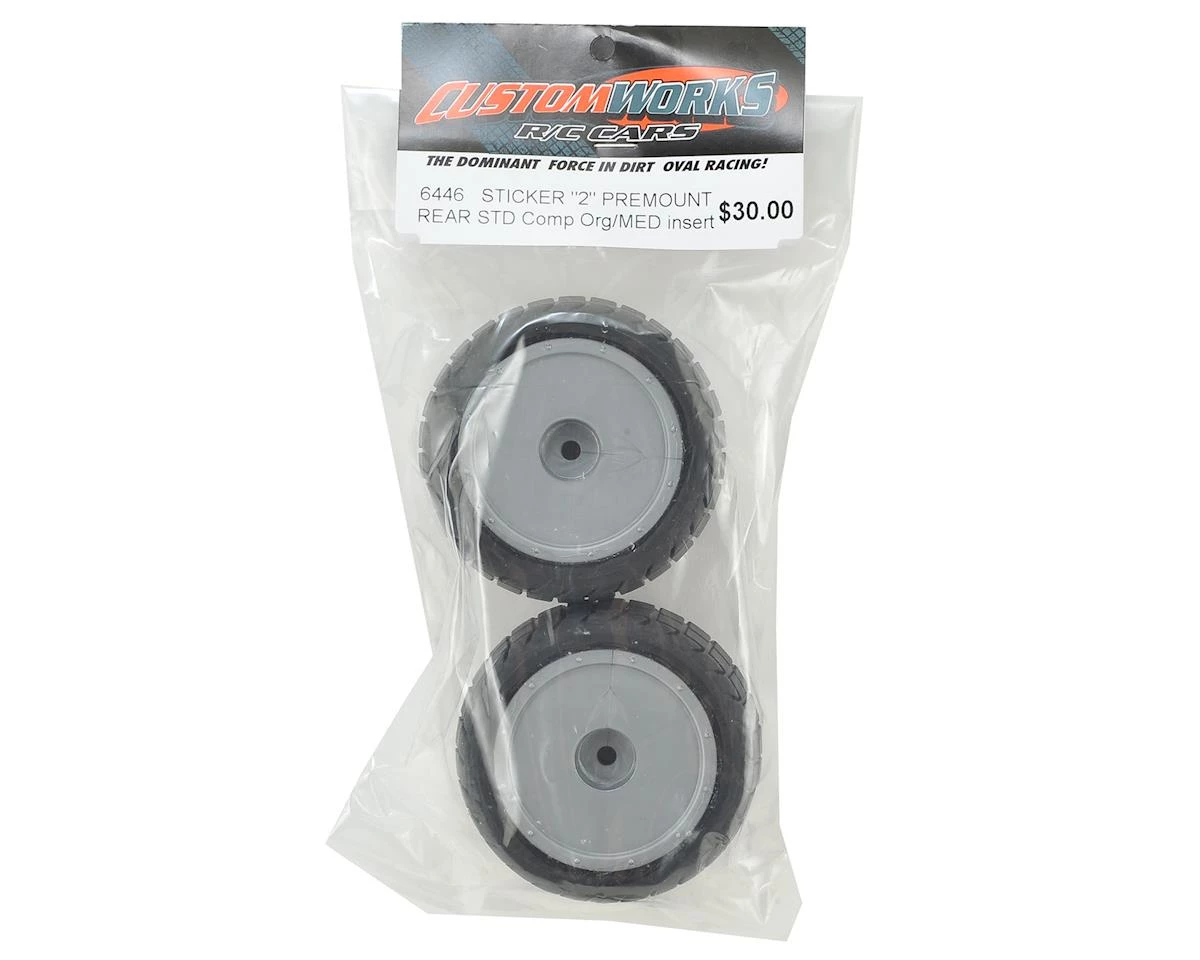 Custom Works Sticker 2 Dirt Oval Rear Tires. The redesigned Sticker 2 rear rubber tire is available in High Bite (HB) and Standard Compounds. Used in conjunction with the Sticker Front tire, these tires are intended for use on high bite cars like the Enforcer and Intimidator on smooth surfaces like clay and carpet. These tires are pre-mounted on standard Custom Works 2.0″ rubber tire wheels with orange medium inserts. Package includes two rear tires.