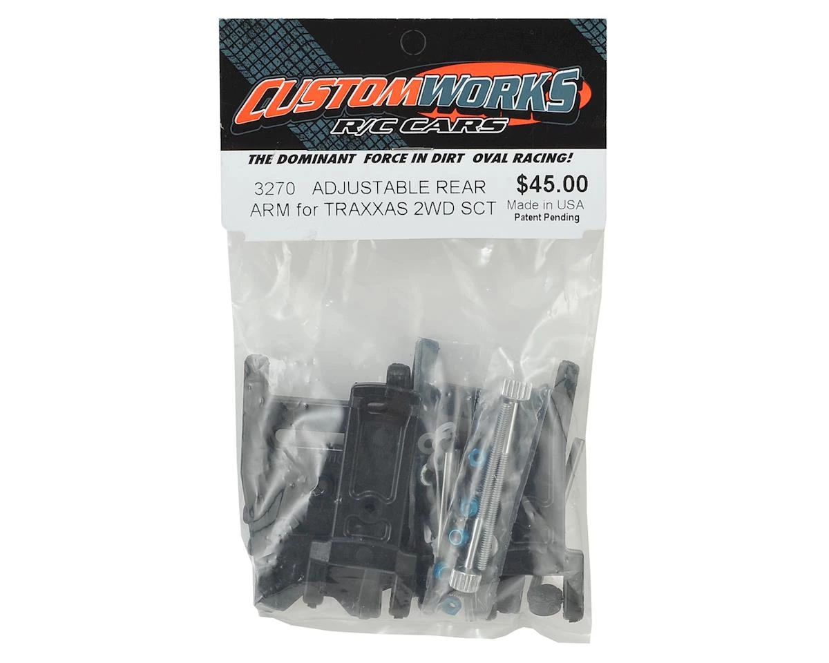 Custom Works Traxxas Slash Dirt Oval Adjustable Arm Kit. These are an optional upgrade for the Traxxas Slash kits used for oval racing. These allow you to easily change the rear toe settings on the car as track conditions change throughout the day. Package includes all the parts needed for the conversion.
