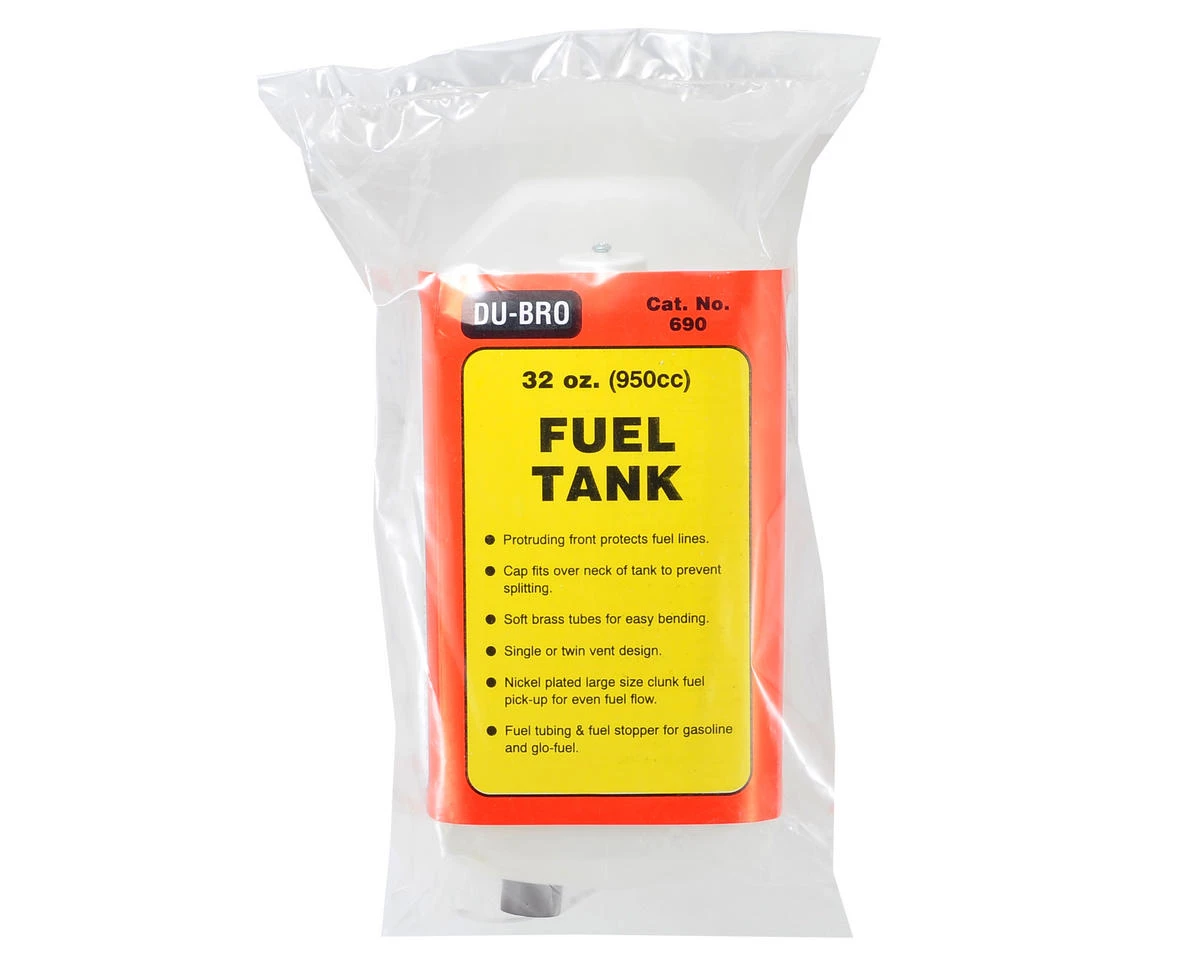 This is a Du-Bro 32 Ounce Fuel Tank. This tank comes complete with a stopper and fuel tubing for both gas and glo-fuel, and proportionally larger brass tubing and clunk. Du-Bro fuel tanks will not split or crack from vibration or pressure. Du-Bro Fuel Tanks are designed to be tough! In fact, this fuel tank can be used with a pressurized fuel system!