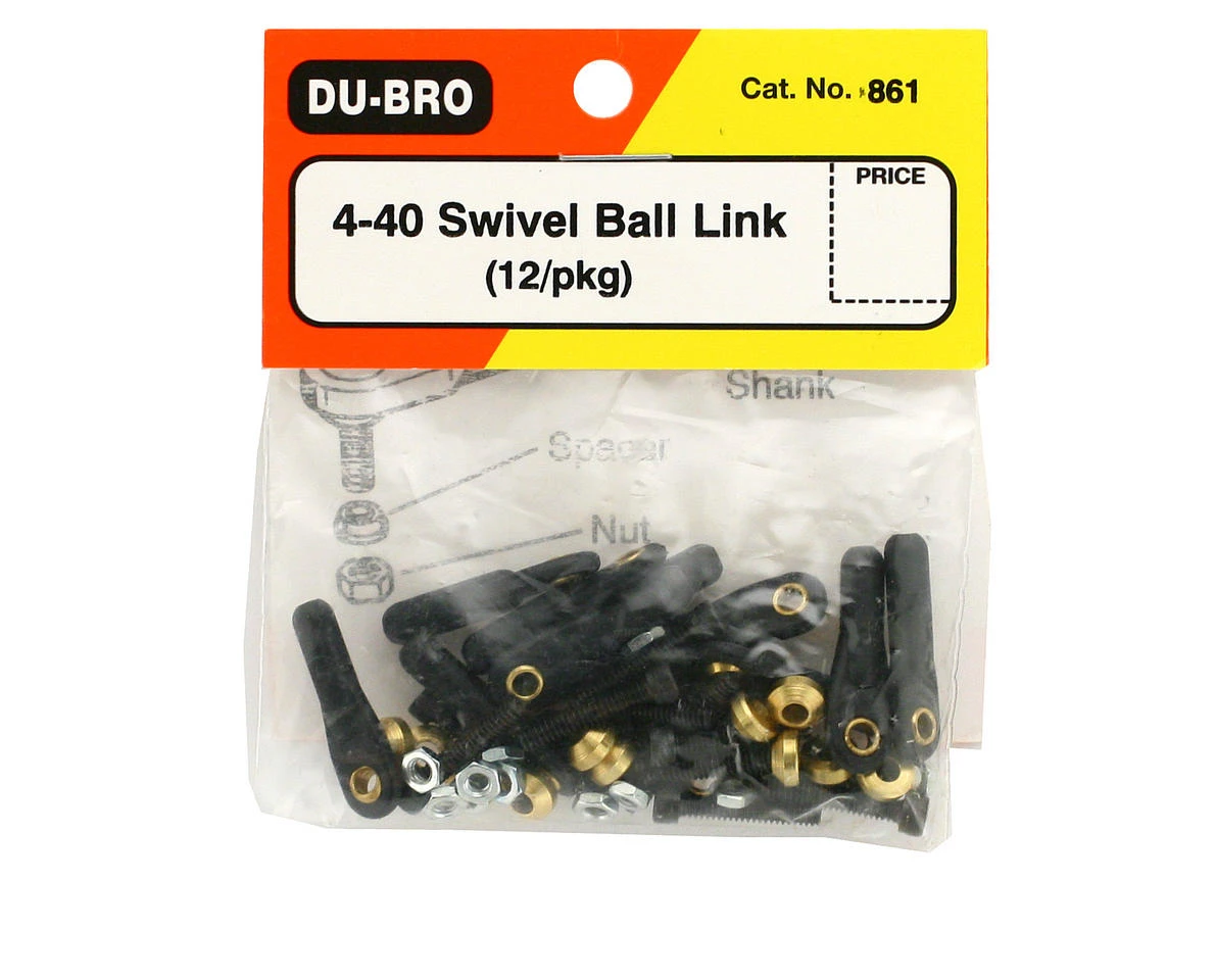 This is a pack of twelve Du-Bro RC 4-40 Swivel Ball Links. These high quality ball links feature burnished brass swivel balls for smooth operation. Complete with socket head cap screw, brass shim and hex nut.