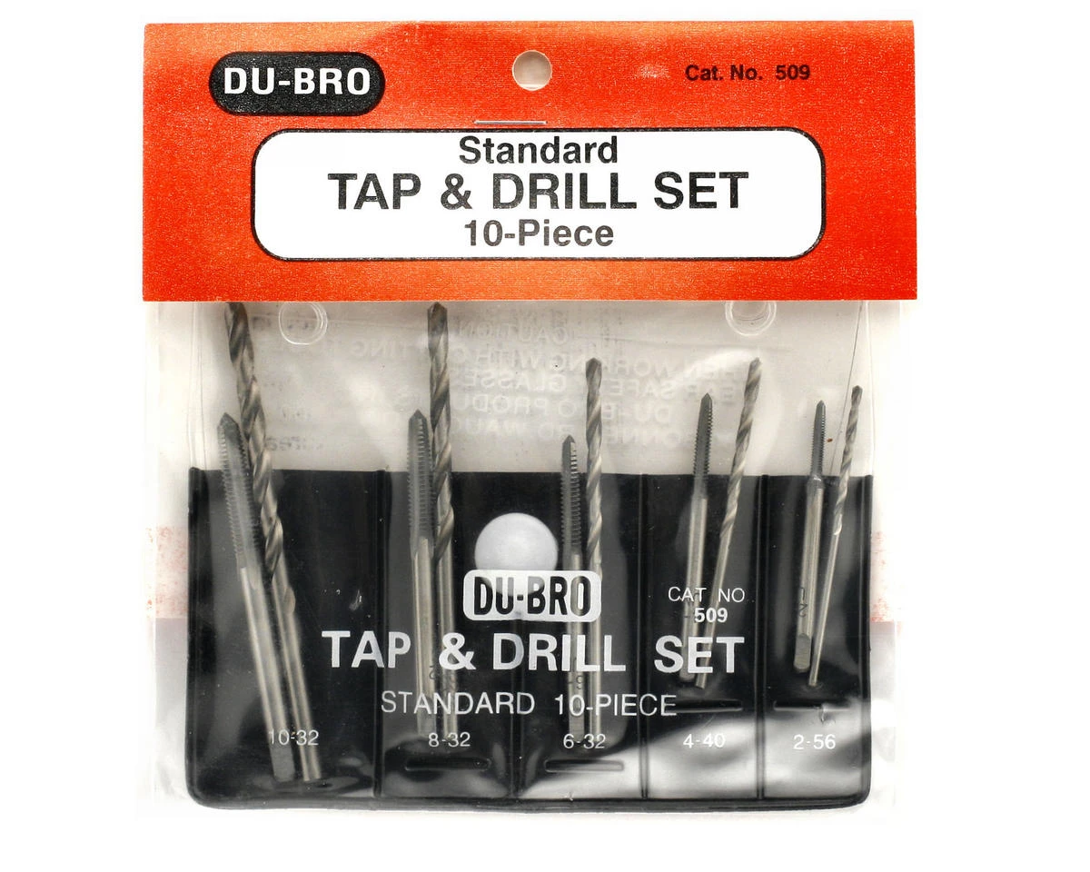 This is a ten piece set of standard size taps and drills from Dubro. This convenient set of taps and drills saves you the time and cost of purchasing individual sets. This complete package comes in a vinyl storage case. Made of high-quality steel. Tap handle not included.