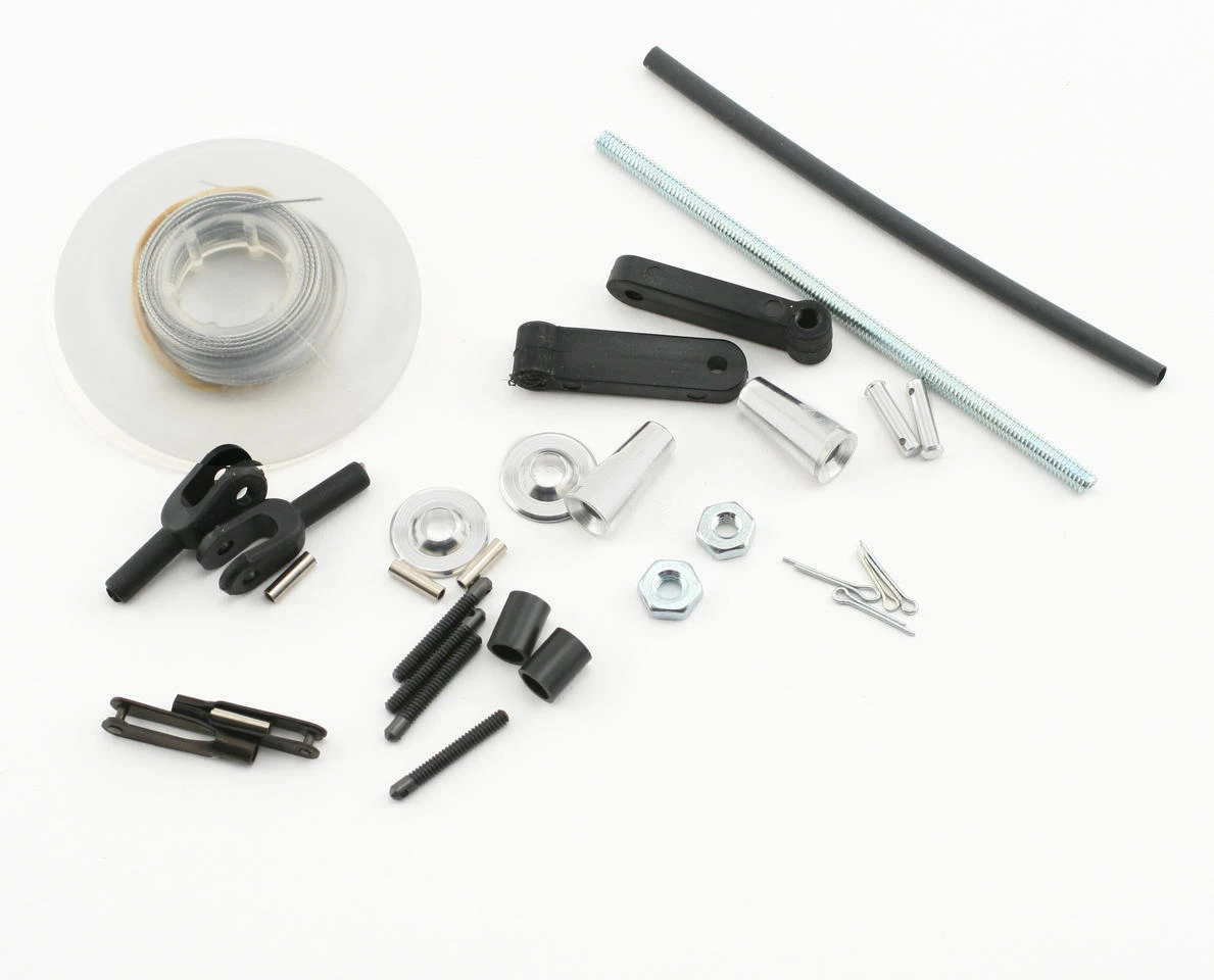 This is the Du-Bro RC Heavy Duty Dual Pull-Pull System for large aircraft .91 and larger. This pull-pull system comes complete with high quality aluminum horns, washers, steel 8-32 long shaft, nuts, horn arms, and cleveses (for 4-40 rods) with aluminum pivot pins plus 15ft. of nylon coated stranded steel cable (.032 dia.) and all mounting hardware for 4-40.