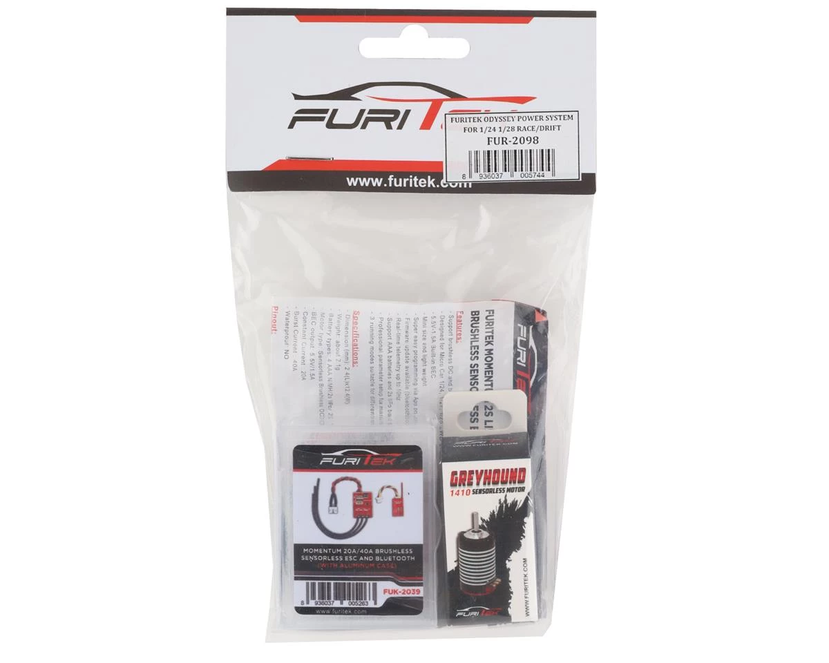 Furitek 1/24 Odyssey Power System w/Brushless Motor. This optional power system has been designed specifically for 1/24 or 1/28 Racing or Drifting applications. The included Furitek Momentum ESC features an aluminum case and is programmable using the included Bluetooth adapter. A Greyhound 1410-3500kV is used in this kit for great reliable power.